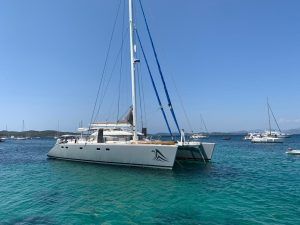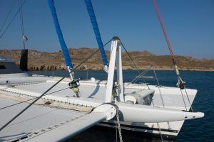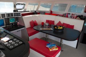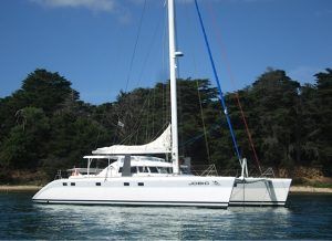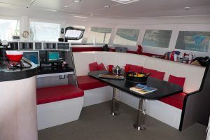 Cet AIKANE 56 est un véritable multicoque d’exception, le designer n’est autre que le cabinet VPLP, le concepteur et premier propriétaire était aussi le concepteur du très apprécié SWITCH 51, AIKANE se veut l’aboutissement de cette expérience avec une construction beaucoup plus sophistiquée réalisée par le chantier de Gil Carmagnani GC Marine Consulting à Trinidad (sandwich mousse 80kg/m3 et nombreux renforts carbone); mât carbone cheminée, gréement textile, poutre de compression et poutre avant composite verre-carbone … L’aménagement et la décoration sont conçus sur pland du cabinet de design Couedel et Hugon et on été réalisés en Bretagne sous la direction de Didier Ragot (second d’Olivier de Kersauson)qui était également en charge du suivi de construction.