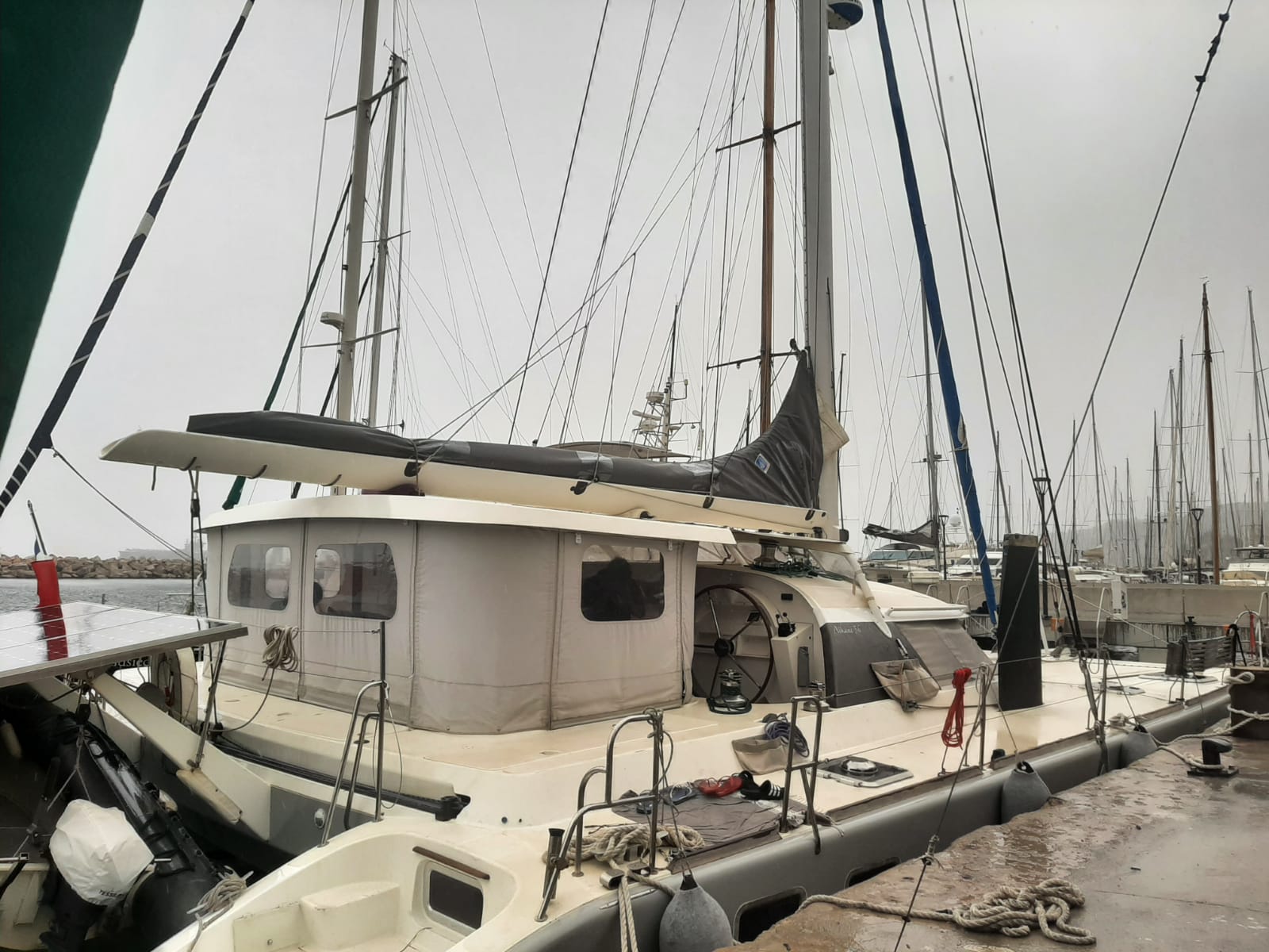 Tout le circuit électrique a été refait avec remplacement de tout le câblage et installation de deux alternateurs Balmar 90A (ancien système remplacé), un inverter Victron 5000 + inverter/chargeur Victron 3000 (back-up en cas de panne du 5000). Toute l’électronique a été remplacée: Radar Furuno DRS4D NXT, AIS Vesper Marine, ordinateur Rom Arrange avec MaxSea TZ NAVIGATOR et les modules radar + Routage météo. Un deuxième pilote automatique installé sur support carbone (bras Raymarine, électronique NKE), annexe Xpro Defender 2022 + moteur Suzuki 9,9cv 2023, refit du mat (repeint et renforcé) changement enrouleur génois 2022 (Profurl), gréement textile remplacé en 2018 et resté démâté pendant 3 ans, tête de mat lopolight, lazy bag remplacé en 2022, tous les taquets renforcés avec tissu carbone par le dessous, le grand volume froid de type ‘glacière’ remplacé par un réfrigérateur Vitrifrigo, tous les tissus du salon et cockpit sont neuf (sunbrella), teck cockpit refait en 2023, grande table cockpit en carbone avec un pied unique forme “mât aile” + petite table cockpit en bois avec machine à glaçons. 2 Mouillages: Rocna 33kg + 80m chaîne diam 13+ textile, Delta 45Kg neuve + 100m Chaîne Limousines Grade 70 HR neuve + textile 8 torons. Dessal entièrement révisé. Tous les passes-coques remplacés.