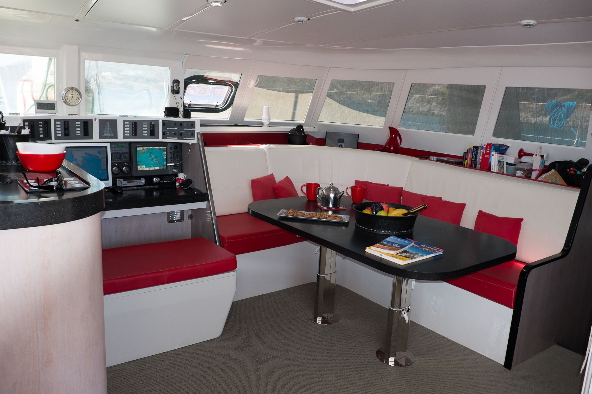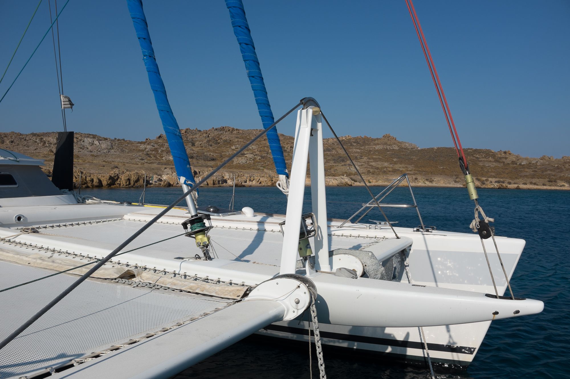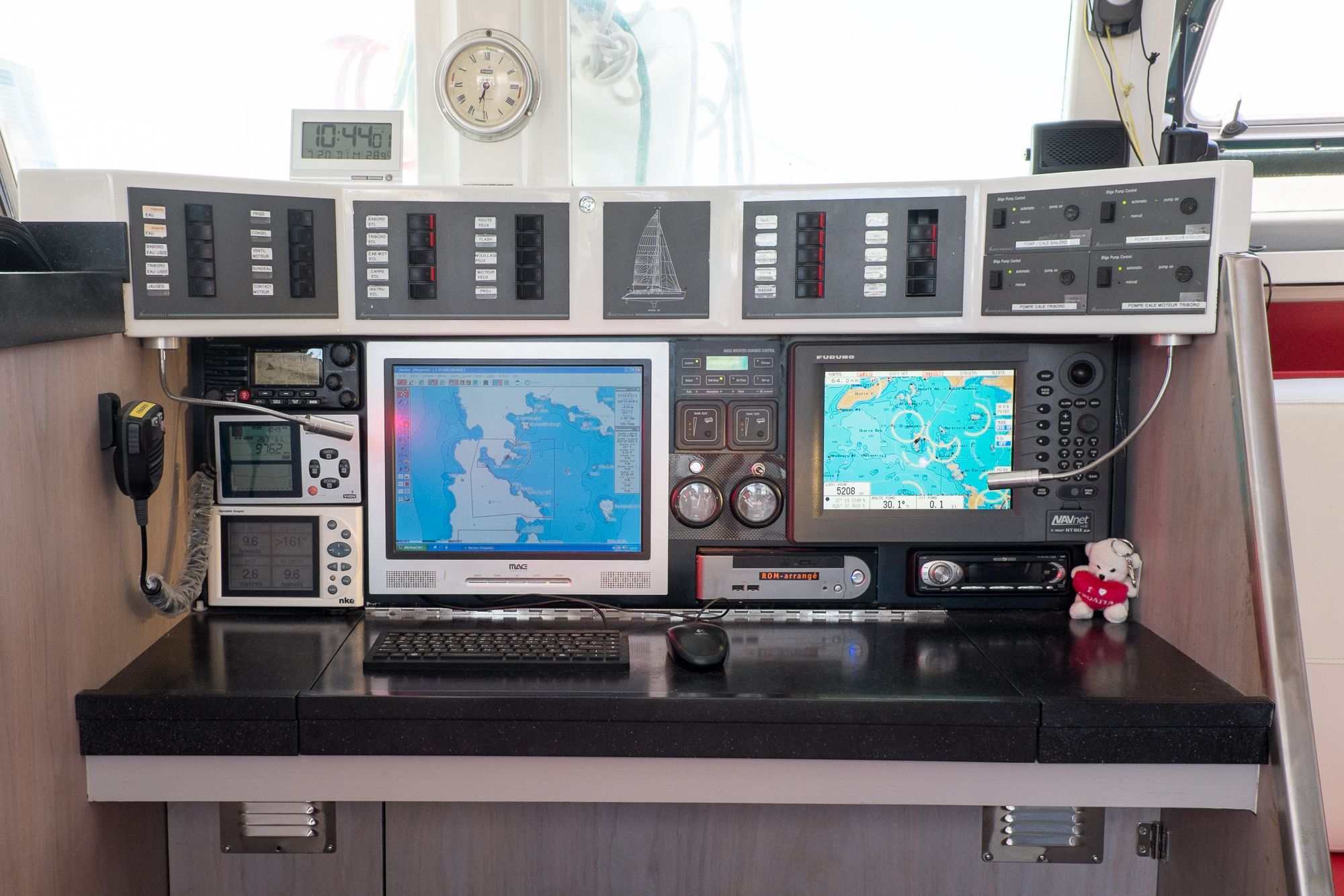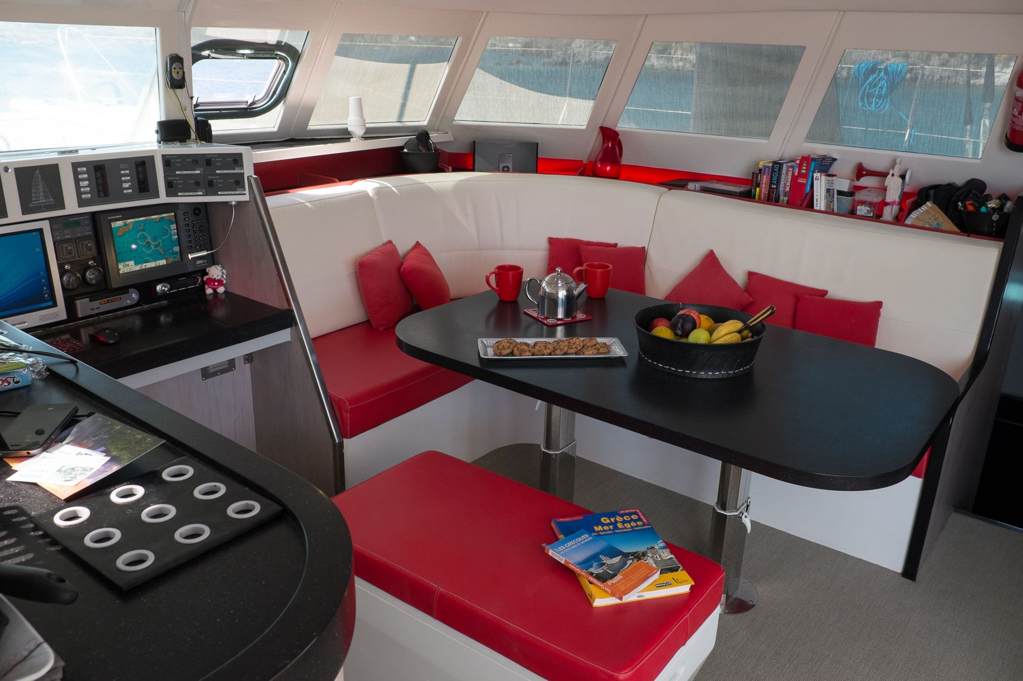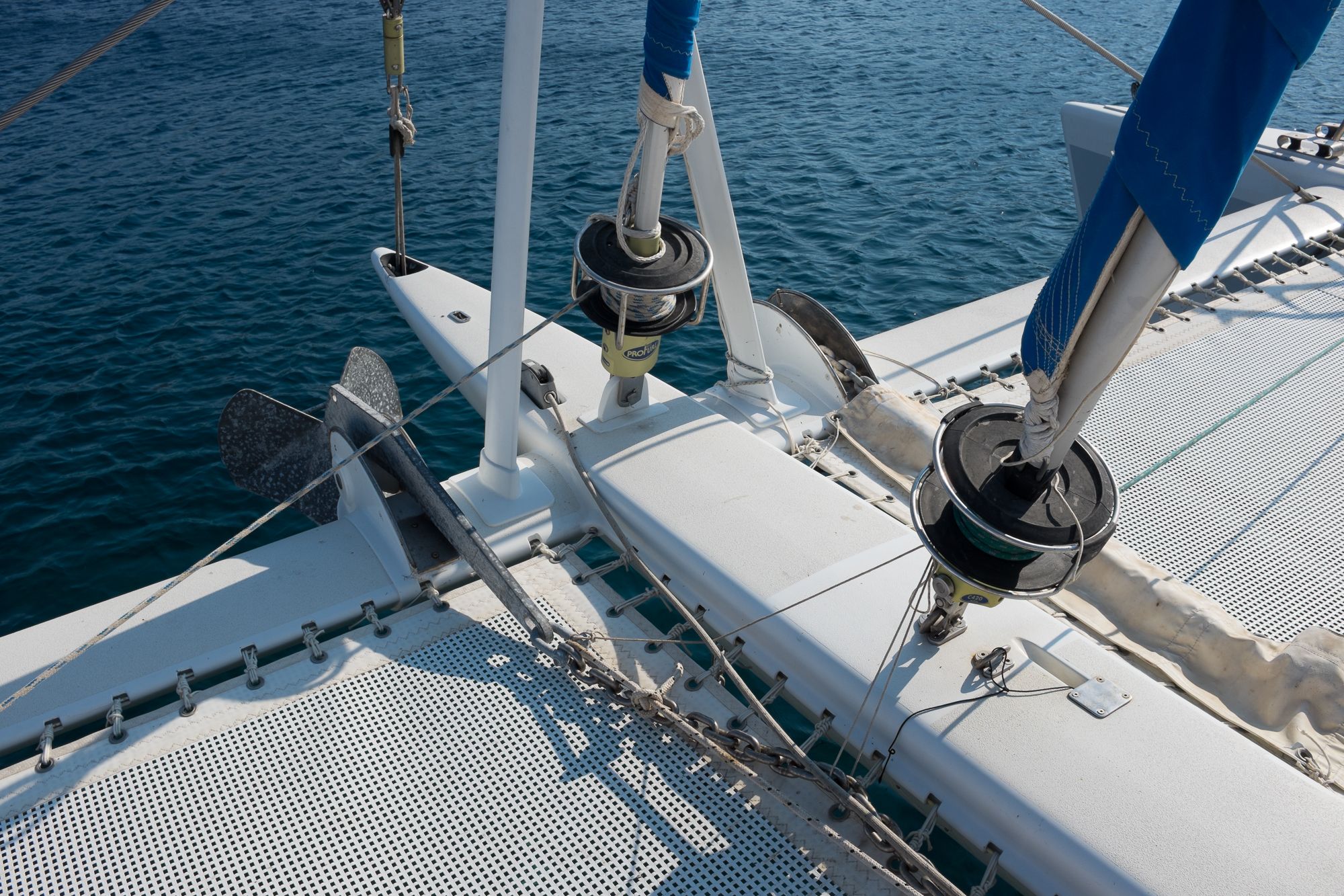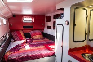 La totalité du circuit électrique a été refaite avec remplacement de l’ensemble du câblage et installation de deux alternateurs Balmar 90A, un inverter Victron 5000 + inverter/chargeur Victron 3000 (back-up en cas de panne du 5000). Toute l’électronique a été remplacée: Radar Furuno DRS4D NXT, AIS Vesper Marine, ordinateur Rom Arrangé avec MaxSea TZ NAVIGATOR et les modules radar + Routage météo. Un deuxième pilote automatique installé sur support carbone (bras Raymarine, électronique NKE), annexe Xpro Defender 2022 + moteur Suzuki 9,9cv 2023, refit et controle technique du mat changement enrouleur génois 2022 (Profurl), gréement textile remplacé en 2018 (Le bateau est resté démâté ensuite pendant 3 ans), tête de mat lopolight, lazy bag remplacé en 2022, tous les taquets renforcés avec tissu carbone par le dessous, le grand volume froid de type ‘glacière’ remplacé par un réfrigérateur Vitrifrigo, tous les tissus du salon et cockpit sont neuf (sunbrella), lattes teck du cockpit refaites en 2023, grande table cockpit en carbone avec un pied unique forme “mât aile” + petite table cockpit en bois avec machine à glaçons. 2 Mouillages: Rocna 33kg + 80m chaîne diam 13+ textile, Delta 45Kg neuve + 100m Chaîne Limousines Grade 70 HR neuve + textile 8 torons. Dessal entièrement révisé. Tous les passes-coques remplacés.