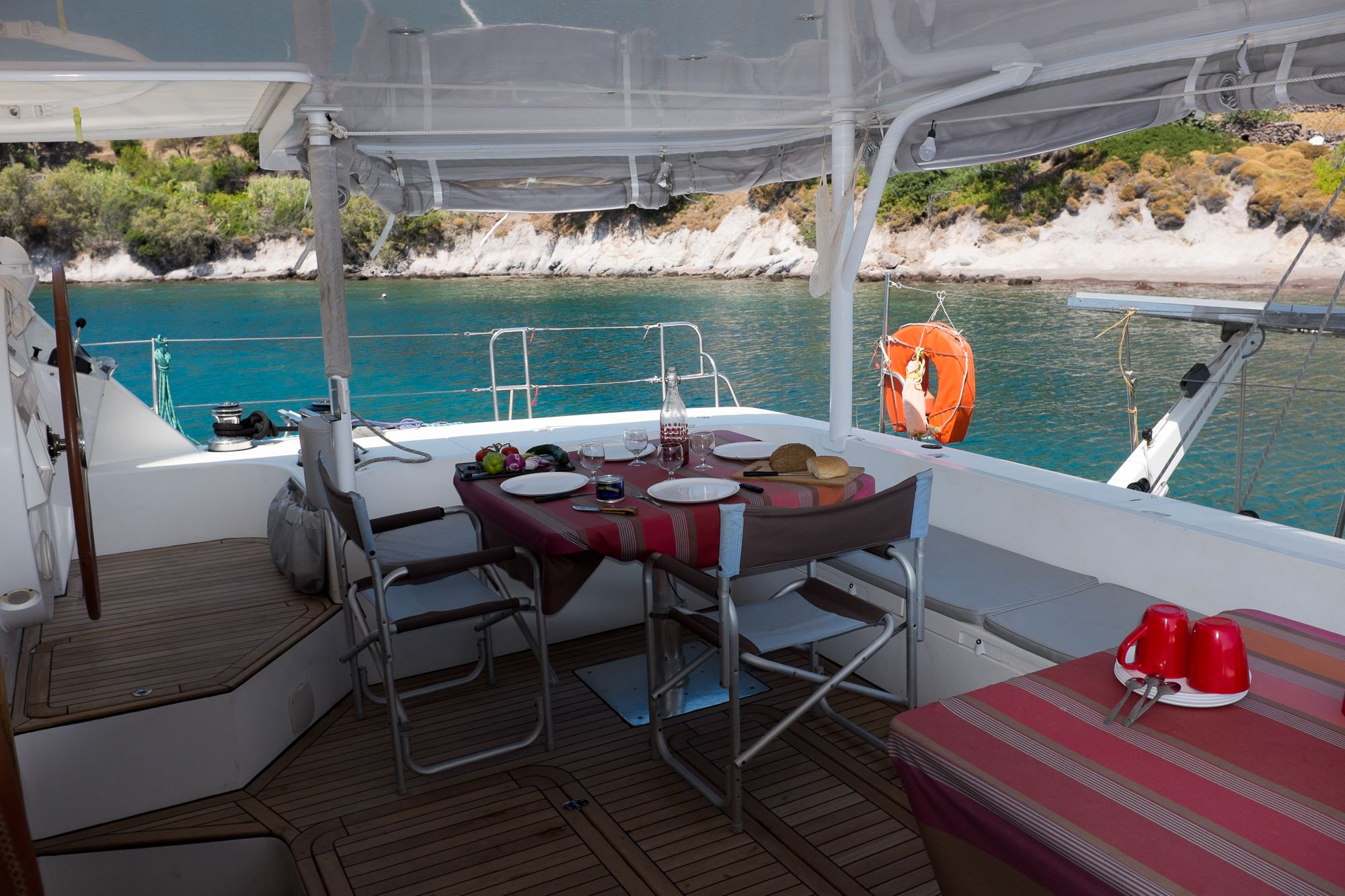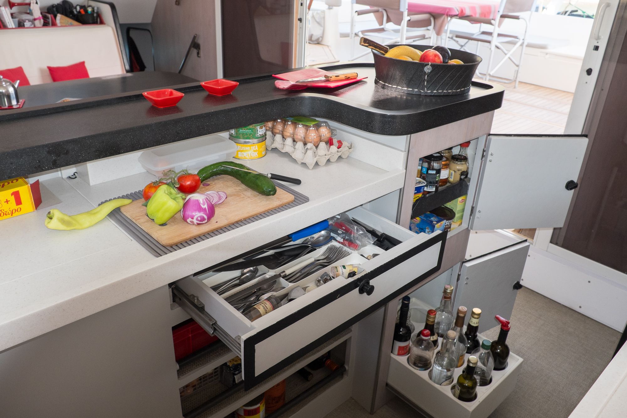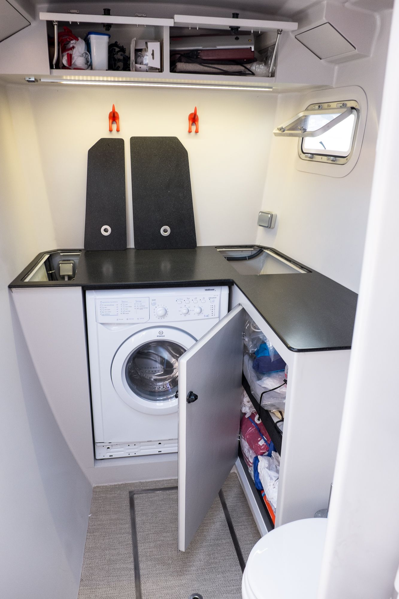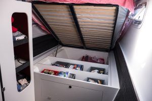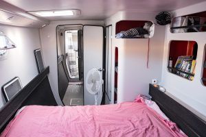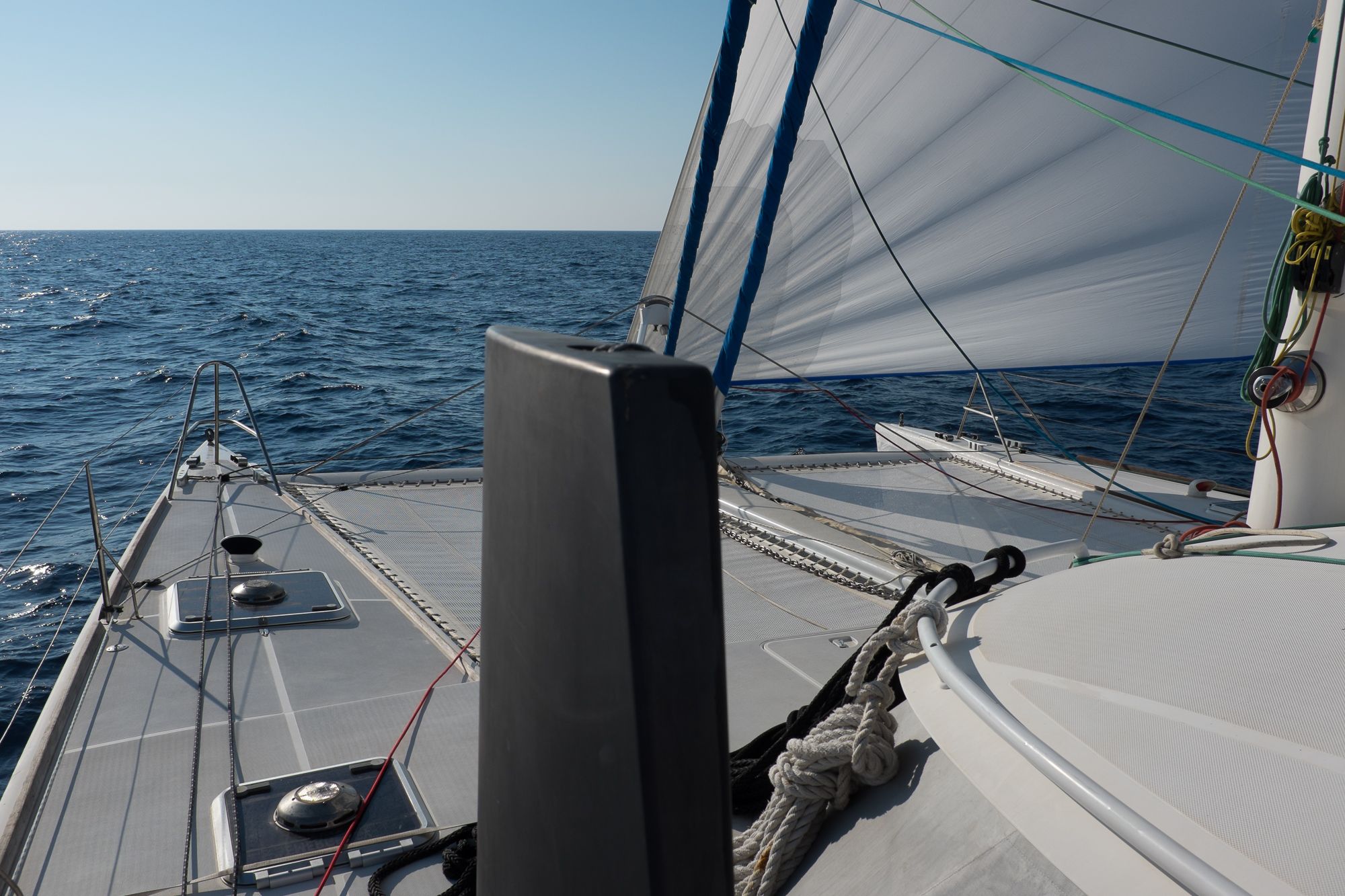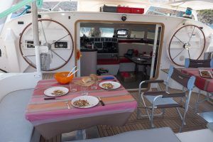 La totalité du circuit électrique a été refaite avec remplacement de l’ensemble du câblage et installation de deux alternateurs Balmar 90A, un inverter Victron 5000 + inverter/chargeur Victron 3000 (back-up en cas de panne du 5000). Toute l’électronique a été remplacée: Radar Furuno DRS4D NXT, AIS Vesper Marine, ordinateur Rom Arrangé avec MaxSea TZ NAVIGATOR et les modules radar + Routage météo. Un deuxième pilote automatique installé sur support carbone (bras Raymarine, électronique NKE), annexe Xpro Defender 2022 + moteur Suzuki 9,9cv 2023, refit et controle technique du mat changement enrouleur génois 2022 (Profurl), gréement textile remplacé en 2018 (Le bateau est resté démâté ensuite pendant 3 ans), tête de mat lopolight, lazy bag remplacé en 2022, tous les taquets renforcés avec tissu carbone par le dessous, le grand volume froid de type ‘glacière’ remplacé par un réfrigérateur Vitrifrigo, tous les tissus du salon et cockpit sont neuf (sunbrella), lattes teck du cockpit refaites en 2023, grande table cockpit en carbone avec un pied unique forme “mât aile” + petite table cockpit en bois avec machine à glaçons. 2 Mouillages: Rocna 33kg + 80m chaîne diam 13+ textile, Delta 45Kg neuve + 100m Chaîne Limousines Grade 70 HR neuve + textile 8 torons. Dessal entièrement révisé. Tous les passes-coques remplacés.