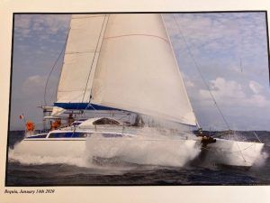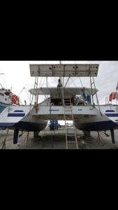 Grand Sud 45 catamaran dessiné par l’architecte Daniel Tortarolo, construit amateur réalisée 1991 en CP époxy.