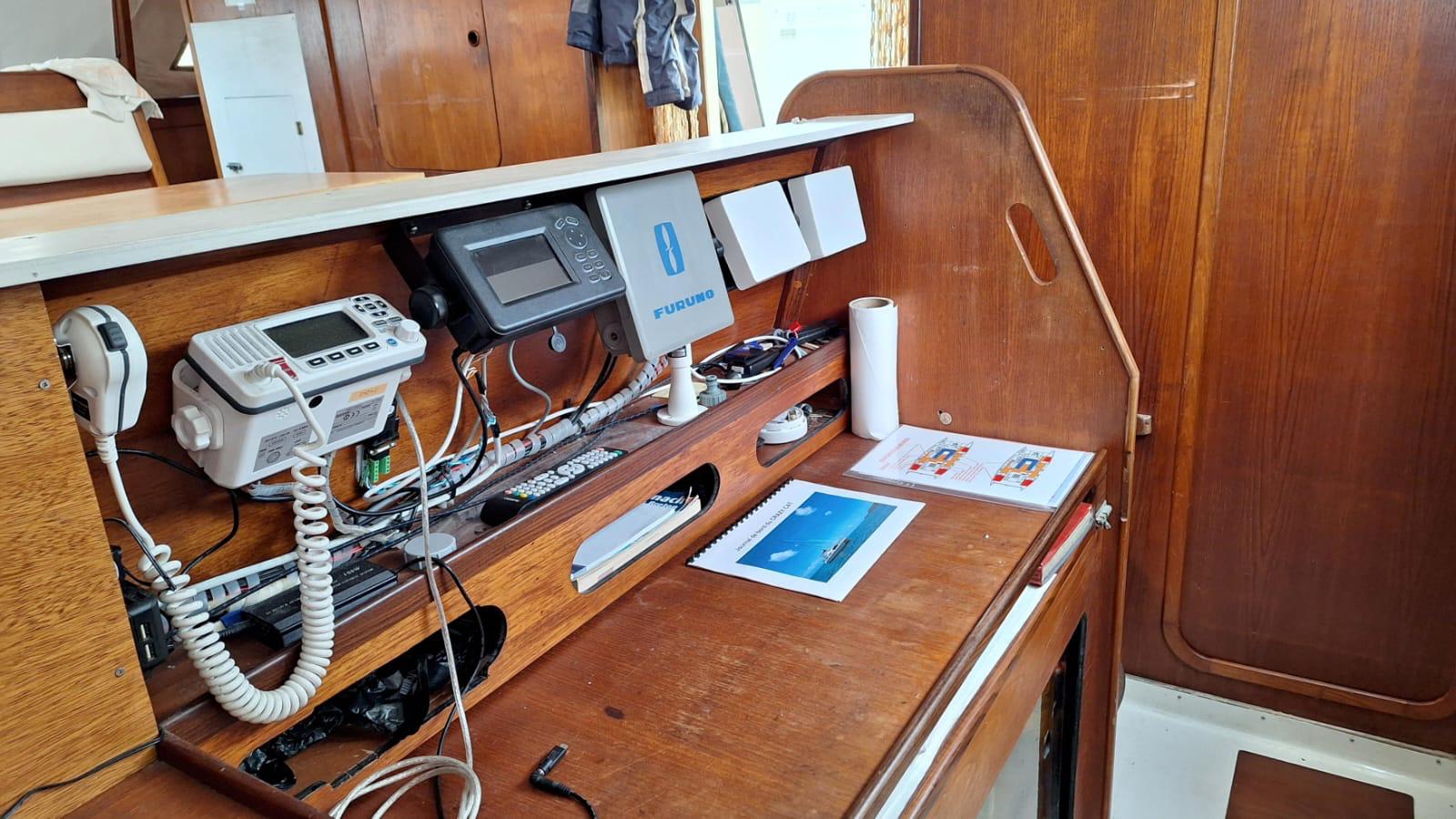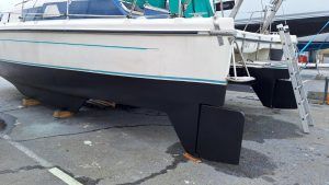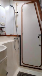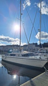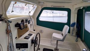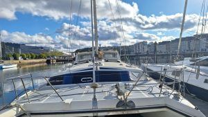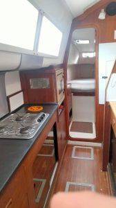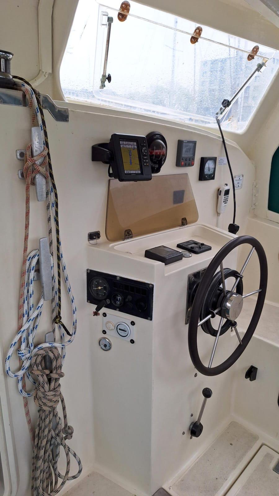 Authentiques emblèmes de la « British way of sailing » les Snowgoose ne sont plus fabriqués mais alimentent régulièrement le marché de l’occasion. Le franc bord est modéré, le roof large reste assez fluide et le fardage faible tout comme l’élévation de la nacelle qui en découle. Un rostre profilé; sorte de 3éme coque centrale rigidifie les fonds et atténue l’impact des vagues et accueille le moteur et l’embase relevable dans sa partie arrière. Le déficit de hauteur de nacelle n’est pas le point fort du bateau mais si vous l’acceptez, vous aimerez tout le rete (faible tirant d’eau, embase moteur relevable, échouabilité, largeur modérée autorisant la navigation sur les voies navigables intérieurs, habitabilité étonnante…). La qualité de fabrication est remarquable, les échantillonages généreux! le centre de gravité assez bas conjugué à un plan de voilure modeste (64m2 au près) contribue à la stabilité sécurisante du bateau.
